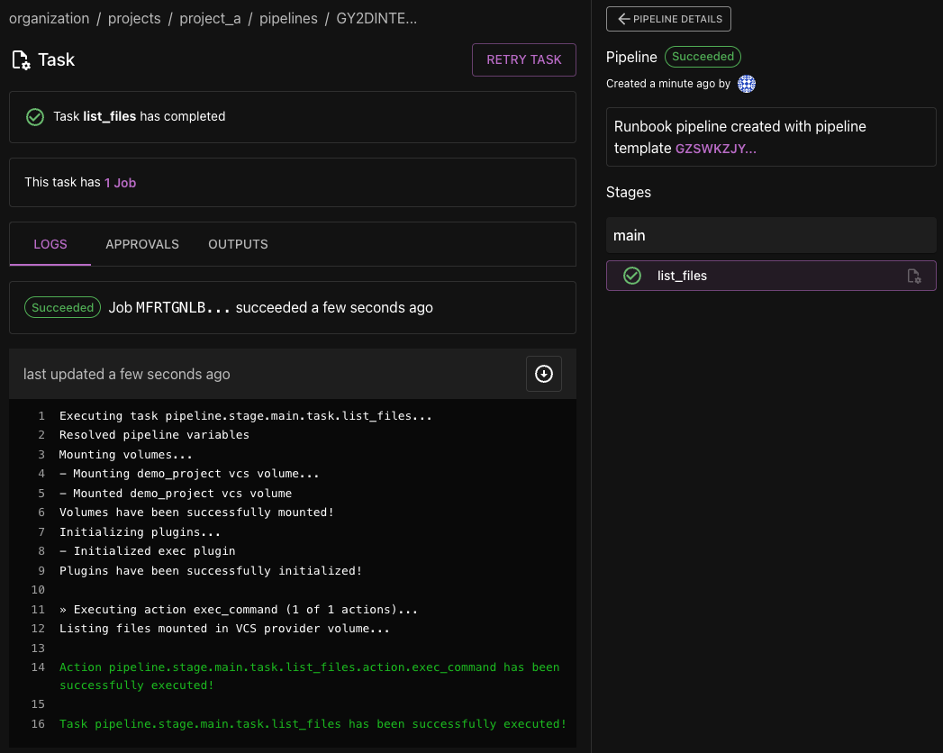 RUNBOOK. Going to its details page, should should see themainstage and thelist_filestask. Navigate to the task details page to see the output of the task.